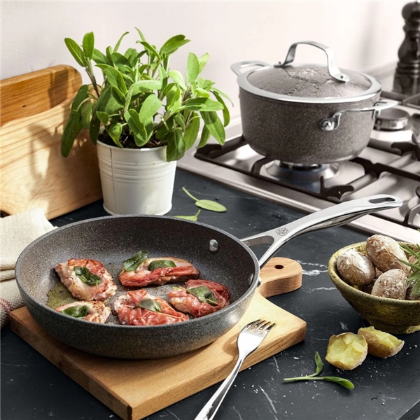 Stekepanne med non-stick belegg fra Ballarini-serien Salina. Kjelen er designet i Milano av Studio Matteo Thun & amp; Antonio Rodriguez og laget i Italia. Pannen varmes raskt opp takket være det smidde, solide aluminiumet den er laget i, mens det ergonomiske håndtaket i rustfritt stål holder seg kjølig. Den slitesterke stekepannen kan rengjøres i oppvaskmaskinen og er ekstremt motstandsdyktig mot riper. Det innovative non-stick belegg GRANITIUM Ti-X i 6 lag pluss et annet titanlag forsterket med mineralpartikler i bunnen av kjelen er det som gjør den ekstra holdbar.
