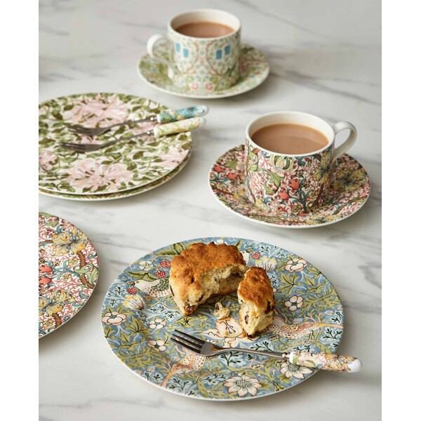 Dette er en serie i porselen som er laget for å feire Morris & Co 160 års jubileum. Den fantastiske paletten med gamle mønstre fra William Morris arkiv skaper en nydelig serie som passer de fleste hjem! De inngående mønstrene er Strawberry Thief, Blackthorn, Golden Lily og Honeysuckle.