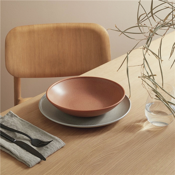 Thomas Clay Deep plate 23 cm fra Rosenthal er en steintøystallerken med plissert mønster som går fra toppen til midten av tallerkenen og finnes i flere farger. Tallerkenen passer til både supper og pastaretter. I serien er det ulike deler som passer sammen eller i kombinasjon med andre farger.