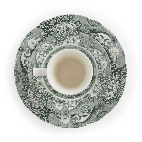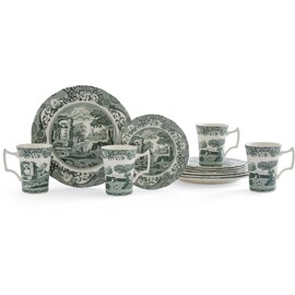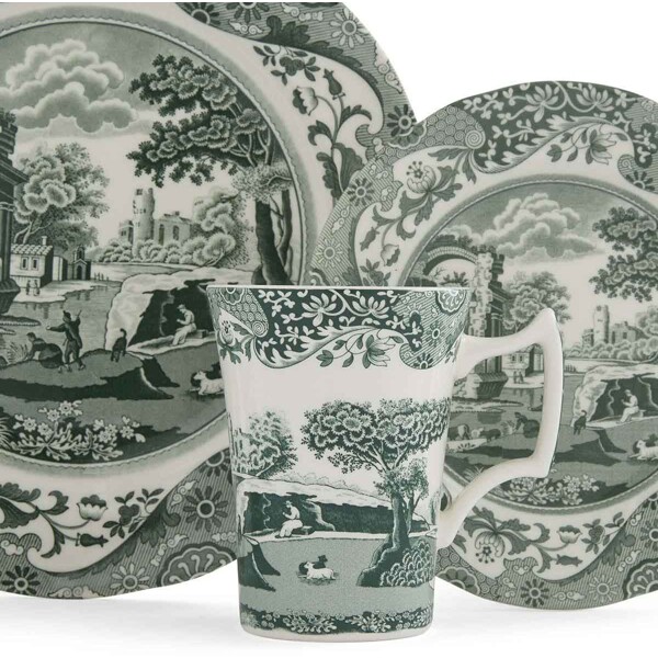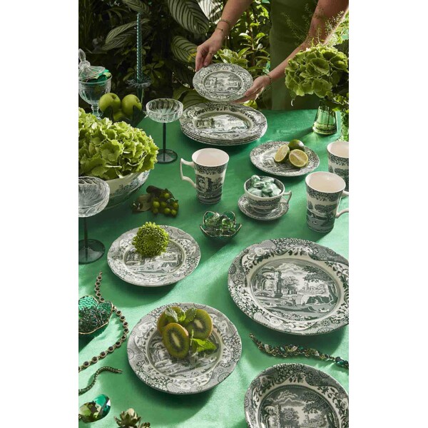 Heritage Green Italian 12-dels sett er en vakker introduksjon til en av Spodes mest elskede servisemodeller – nå i en dypgrønn tolkning av det klassiske Blue Italian-mønsteret. Settet inneholder fire middagstallerkener, fire mindre tallerkener og fire krus – alt i Spodes høykvalitets porselen med velkjente former og dekor.Motivene er inspirert av det pittoreske italienske landskapet, innrammet av det elegante 1700-talls Imari Oriental-mønsteret som løper langs kantene. Settet passer like godt for hverdagsmåltider som for finere borddekkinger, og er et utmerket valg for den som vil begynne å samle på denne ikoniske serien.Produsert i Stoke-on-Trent, England – navet for britisk porselenstradisjon siden 1700-tallet.Innhold & mål:4 × Tallerken Ø27 cm – høyde 2 cm 4 × Tallerken Ø20 cm – høyde 2 cm 4 × Krus 0,28 L