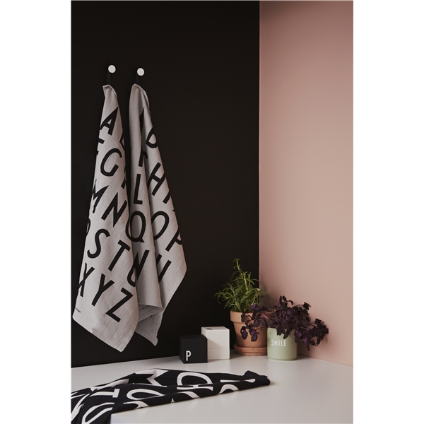 Design Letters klassiske og ikoniske håndkle med store bokstaver fra A-Z designet av Arne Jacobsen i 1937. Trykket på kjøkkenhåndkleet er gjenaktivt hvilket gir en høy absorberingsevne. Finnes i flere farger. Håndklærne kommer i 2-pack.