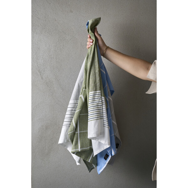 Rustikk kjøkkenhåndkle i resirkulert materiale som kombinerer slitestyrke med en naturlig følelse. Det rutete vevet gir et klassisk uttrykk som passer både i landkjøkken og moderne hjem. Hurtigtørkende, absorberende og en naturlig del av et velutstyrt kjøkken.