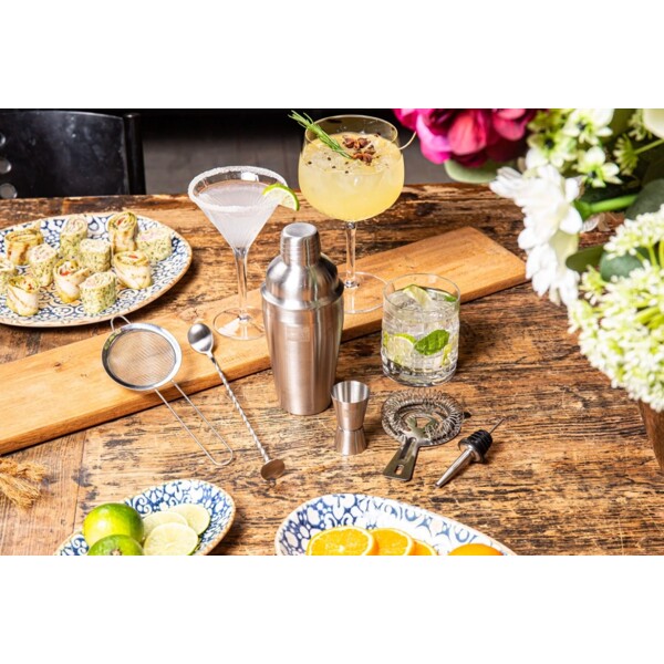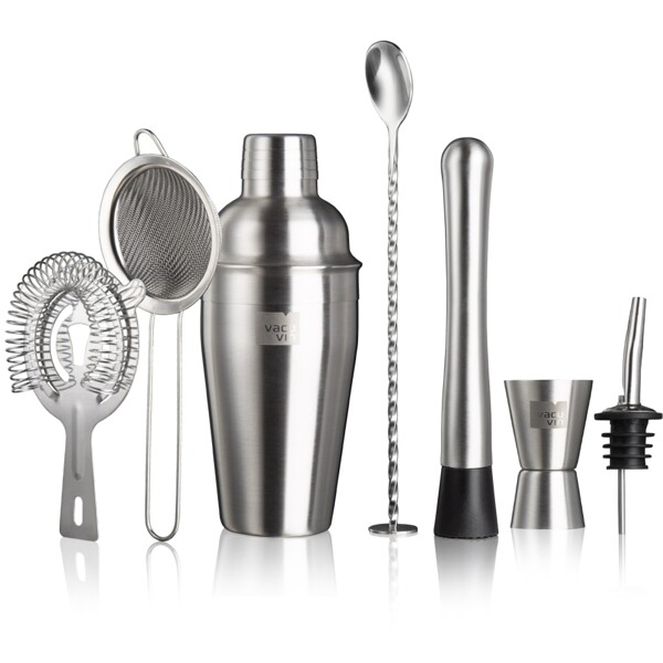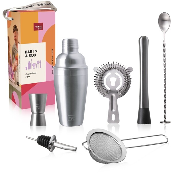 Dette Cocktail Set inneholder 7 verktøy for å lage forskjellige cocktails eller blandede drinker. Et komplett sett for den profesjonelle hjemmebartenderen! Cocktailshaker (550 ml) for å blande og riste dine favorittdrikker. Dobbelt måleglass (15-30 ml) for å måle 1 eller 1/2 deler av spritingredienser. Muddler for å knuse eller røre frukt- og urteingredienser. Sil for å filtrere is eller ingredienser mens du heller fra shakeren. Finsil for å filtrere små deler av is eller ingredienser for en klar drink. Helletut for å smidig servere sprit fra flasken. Barskje for å forsiktig lage omrørte cocktails eller lage cocktails i lag. Alt pakket i en gaveeske.