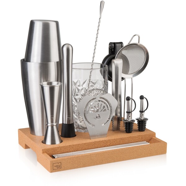 Funksjoner: Unikt elegant korkstativ for å vise frem verktøyene. Inkluderer et oppskriftshefte: Enkle å følge cocktailoppskrifter som du kan prøve hjemme. Kanaliser din indre hjemmebartender med verktøy fra Vacu Vin og oppskrifter fra cocktailproffen. Komplett cocktailsett med 16 barverktøy for å lage shakede og rørte cocktails med stil. Det er den perfekte gaven til alle cocktailelskere. Bland, shake, feire!