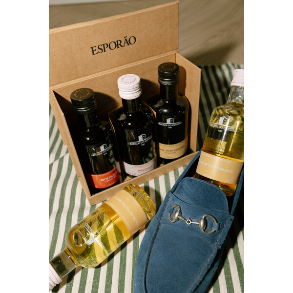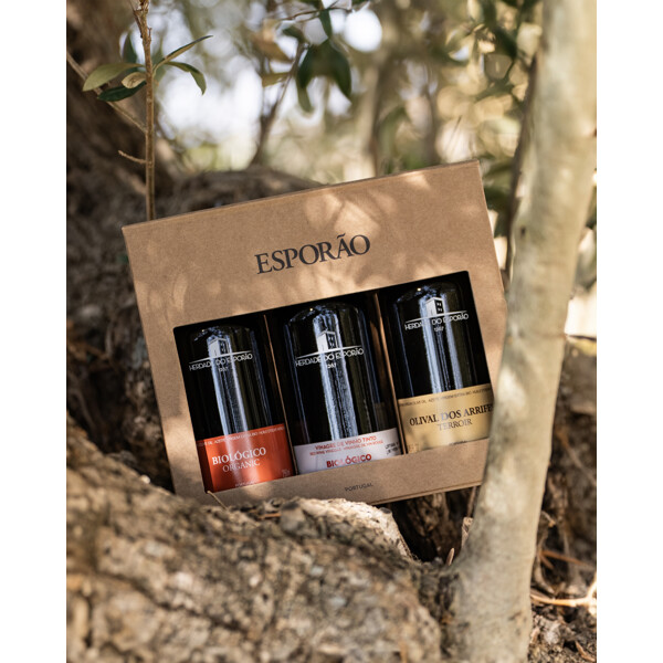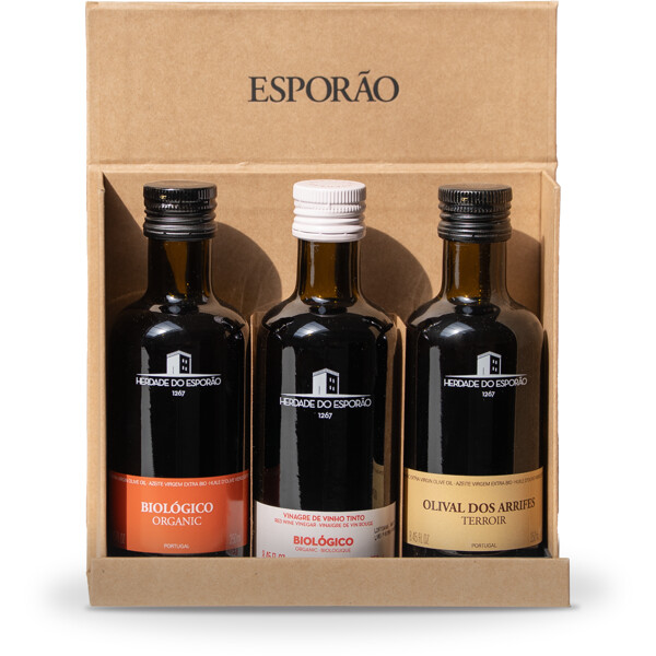 Verdsatt gaveeske inneholdende to stykker økologiske olivenoljer med to forskjellige karakterer samt en økologisk rødvinseddik.