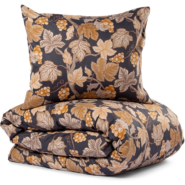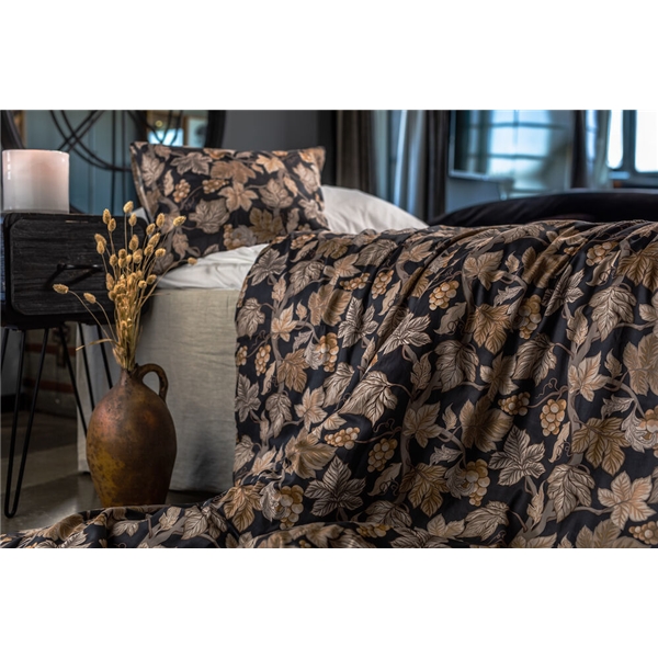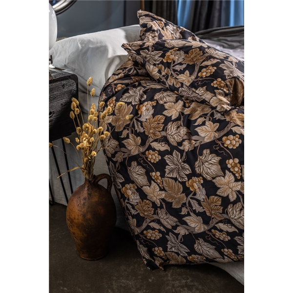 Sengesettet i fin sateng med blader og druer i forskjellige brune farger skaper et koselig innslag når høsten og mørket kommer.