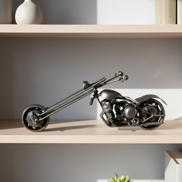 Slipp løs din indre rebell med vår håndlagde Chopper-skulptur, laget av resirkulert metall av dyktige håndverkere. Hver detalj gjenspeiler en fortelling om forvandling, der kasserte materialer blir til et symbol på frihet og dristig design. Denne unike metallmotorsykkelkunsten gjør et dristig inntrykk i ethvert rom, og kombinerer en rå estetikk med detaljer fra resirkulerte deler. Den fungerer som en hyllest til en unik livsstil og miljøbevisst håndverk, perfekt for motorsyklister og kunstsamlere.