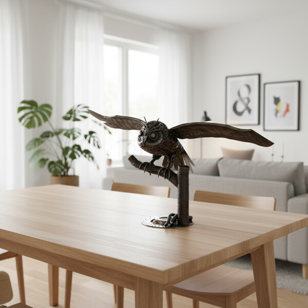 Forhøy din dekor med den fengslende tilstedeværelsen av denne utrolige, 100 % håndlagde metallskulpturen av en flygende ugle! Dette er ikke bare en dynamisk dekorasjon; det er et genuint kunstverk, nøye laget av resirkulert metall, noe som gjør det til et bærekraftig og fullstendig fascinerende tillegg til ethvert hjem, kontor eller lokale. Våre dyktige håndverkere har omformet resirkulerte materialer – merk den fascinerende bruken av ulike metallkomponenter for dens fjærkledde kropp og utstrakte vinger – til en kraftfull detalj av en majestetisk ugle i flukt. Stående på et robust, industrielt inspirert stativ, er hvert element gjennomtenkt integrert og skaper en virkelig unik skulptur som fanger denne nattlige jegerens eleganse og styrke, og blander robust industriell estetikk med naturens majestetiske skjønnhet. Mål: Cirka 65 x 25 x 30 cm Miljøvennlig 100 % håndlaget Resirkulert metall