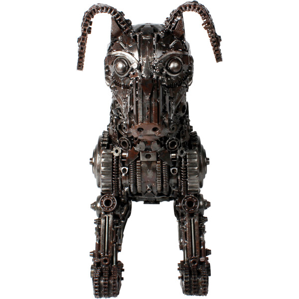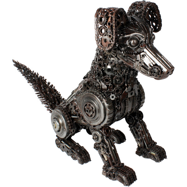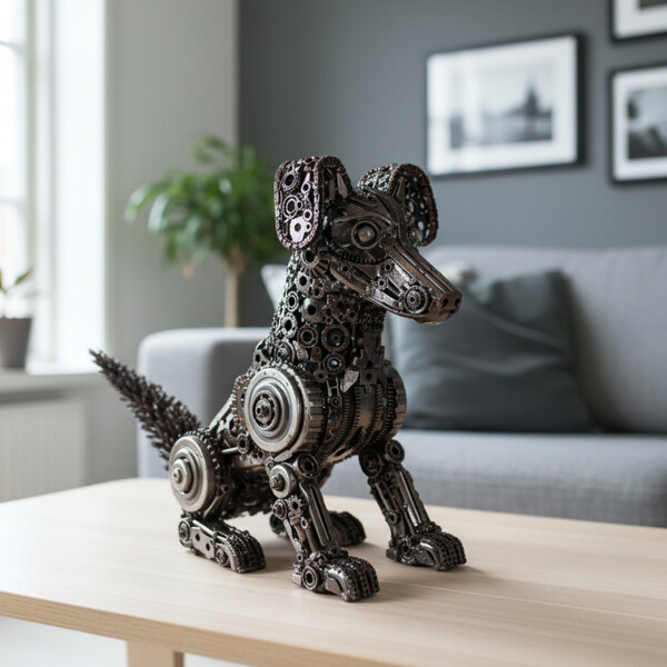 Gi rommet ditt sjarm med vår håndlagde Gear Pup-skulptur, laget av resirkulert metall av dyktige håndverkere. Hver del forteller en historie om forvandling, med lekne detaljer som nysgjerrige øyne og en logrende hale. Denne unike metallhundskulpturen kombinerer rustikk industriell stil med deler fra gjenbrukte materialer, noe som gjør den til en fortryllende samtalestarter og et symbol på bærekraftig kunst. Perfekt størrelse for å tilføre karakter til ethvert hjem, den legemliggjør glede og kreativitet.