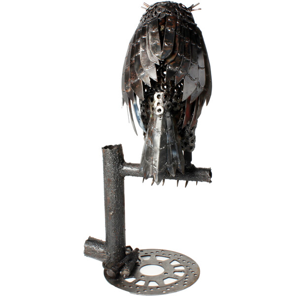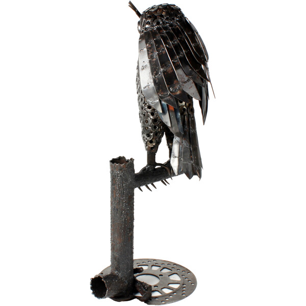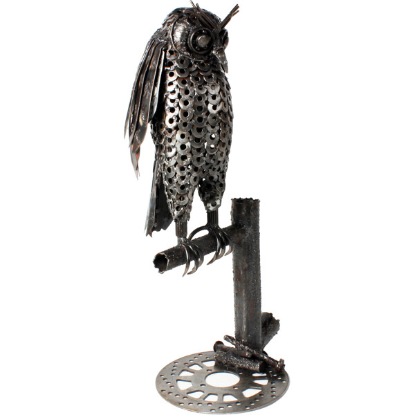 Våre dyktige håndverkere har forvandlet resirkulerte materialer – legg merke til den smarte bruken av metallringer for fjærene og gjenbrukte komponenter for de kloke øynene – til en detaljert og karakterfull representasjon av den majestetiske uglen. Stødig plassert på et industrielt inspirert stativ, skaper dette en virkelig unik skulptur som kombinerer robust industriell estetikk med naturens rolige visdom.