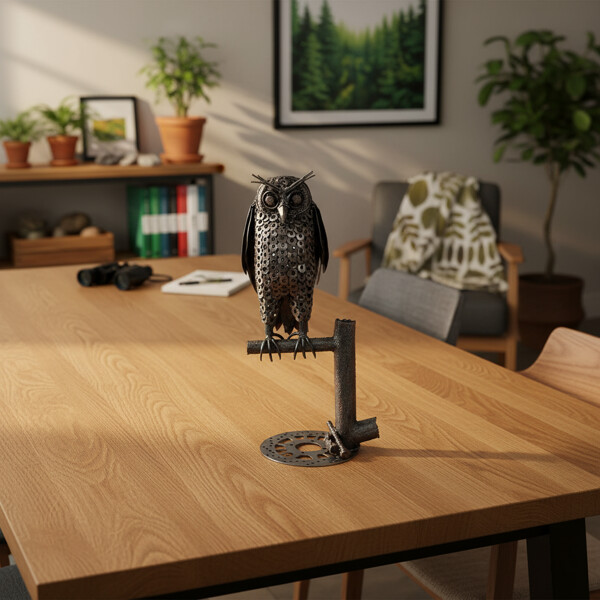 Pryd ditt hjem med vår utrolige 100% håndlagde Wise Watcher Owl-metallskulptur! Dette er ikke bare en fengslende dekorasjon; det er et genuint kunstverk, nøye laget av resirkulert metall, noe som gjør det til et bærekraftig og fullstendig fascinerende tillegg til ethvert hjem, kontor eller bibliotek.