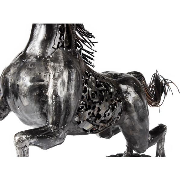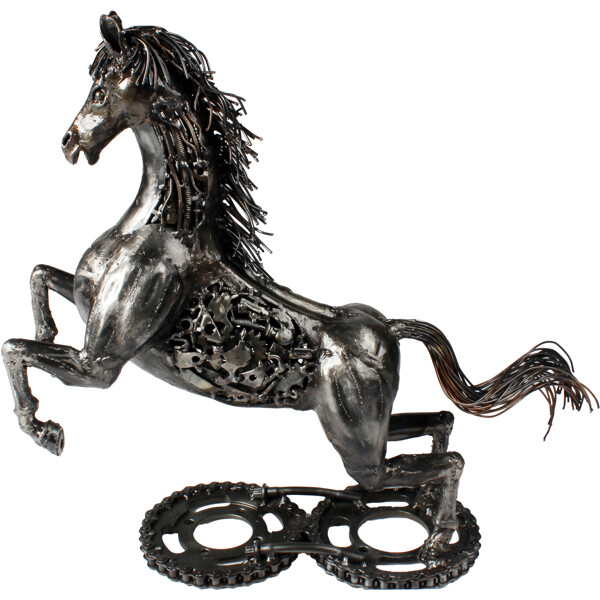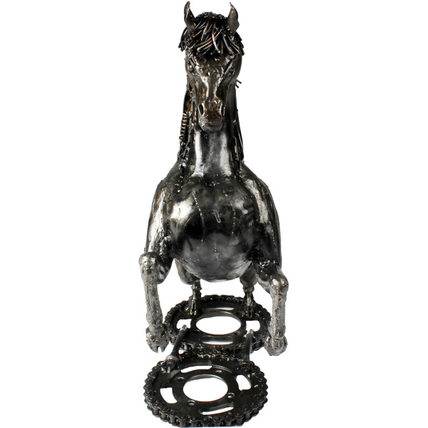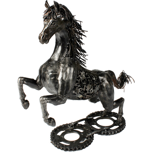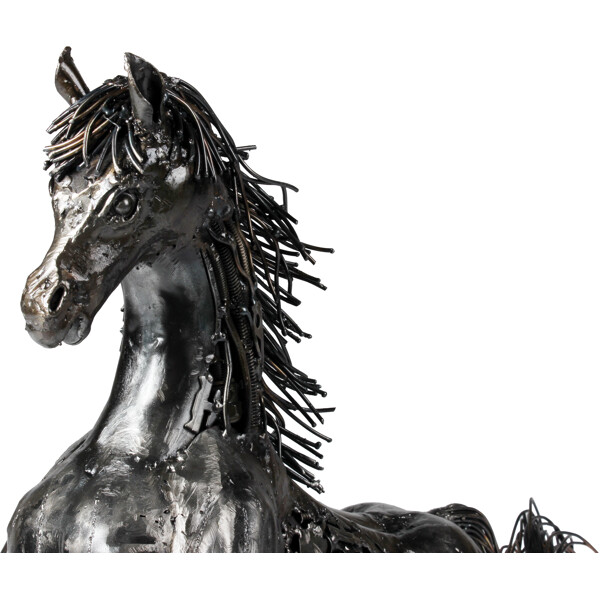 Slipp løs den ville ånden i ditt hjem med vår fengslende Gallant Stallion-skulptur! Dette praktfulle verket er ikke bare en dekorasjon; det er et bevis på bærekraftig kunst, omhyggelig 100% håndlaget av dyktige håndverkere fra resirkulert metall. Hver innviklede detalj, fra den flytende manen til den kraftfulle holdningen, forteller en historie om transformasjon og kreativitet.