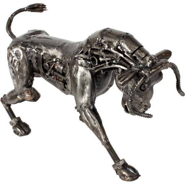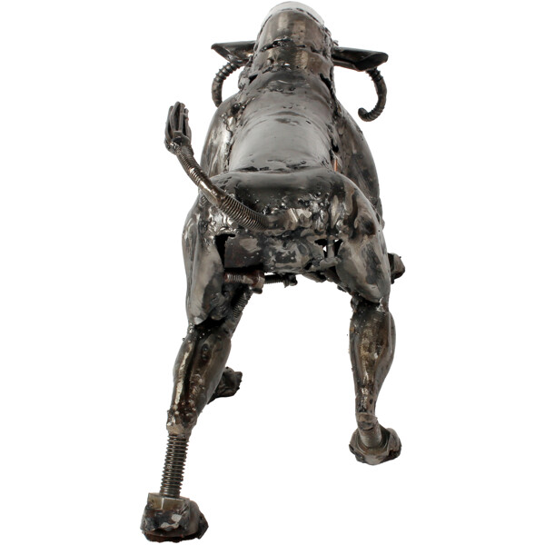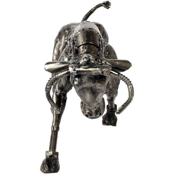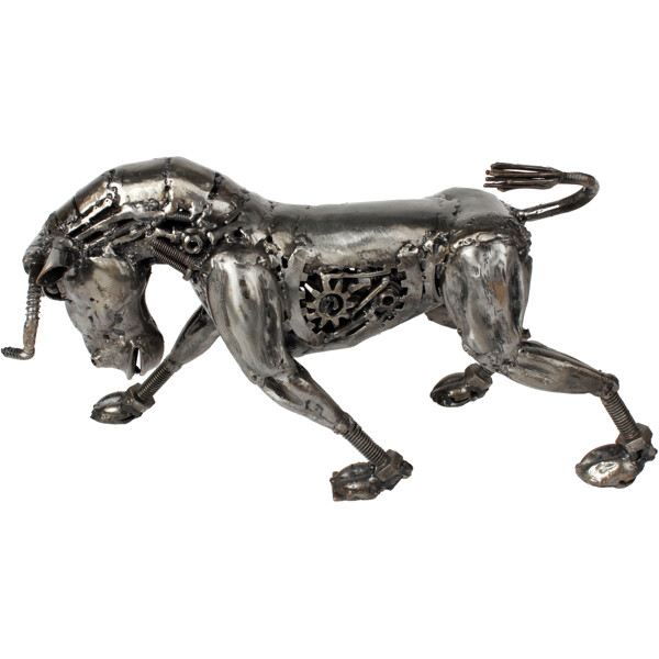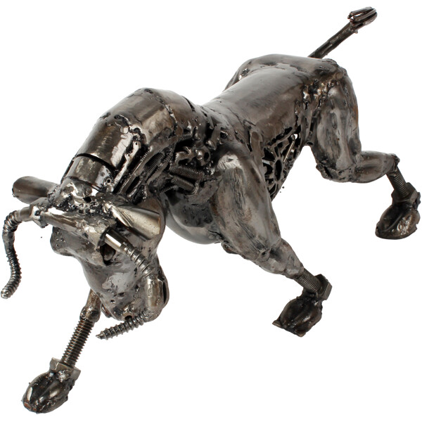 Våre dyktige håndverkere har forvandlet resirkulert materiale til en dynamisk og detaljert presentasjon av en angripende okse. Hver muskel, hver kurve av hornene og dens bestemte holdning er gjennomtenkt, noe som skaper en virkelig unik skulptur som kombinerer rå styrke med intrikat industriell estetikk.