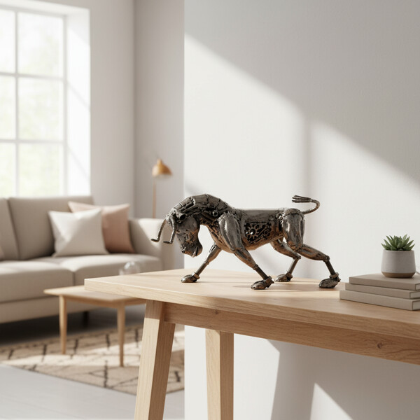 Utemmet skjønnhet med denne utrolige 100% håndlagde oksemetallskulpturen! Dette er ikke bare en kraftfull dekorasjon; det er et genuint kunstverk, nøye laget av resirkulert metall, noe som gjør det til et bærekraftig og fullstendig fascinerende tillegg til ethvert hjem, kontor eller miljø.