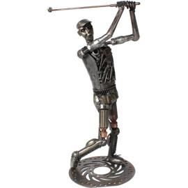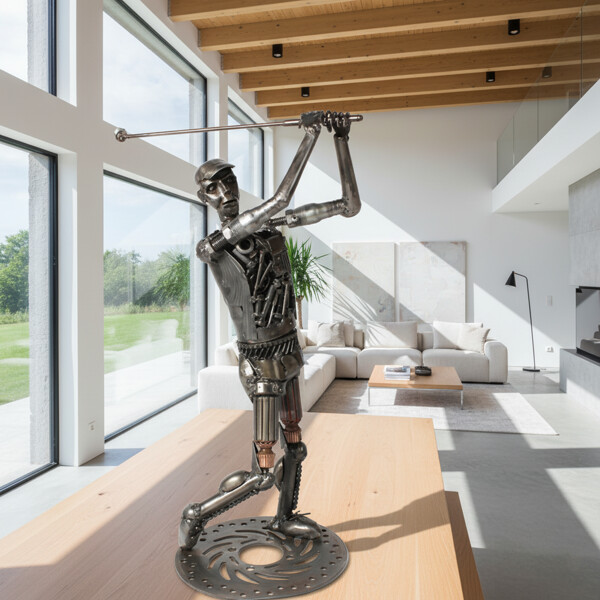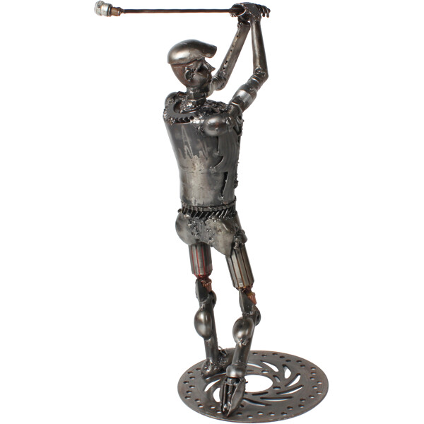 Feir din kjærlighet til golf med vår håndlagde golfspiller-skulptur, laget av resirkulert metall av dyktige håndverkere. Dette detaljerte verket forvandler forlatte komponenter til et levende symbol på engasjement og sport. Den perfekte størrelsen gjør den ideell for skrivebord eller hyller, hvor den kombinerer en industriell estetikk med rike detaljer. Mer enn bare dekorasjon, hyller den spillet og viser frem bærekraftig håndverk, noe som appellerer til både golfentusiaster og kunstbeundrere.