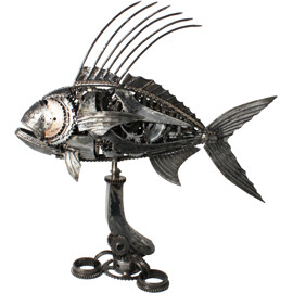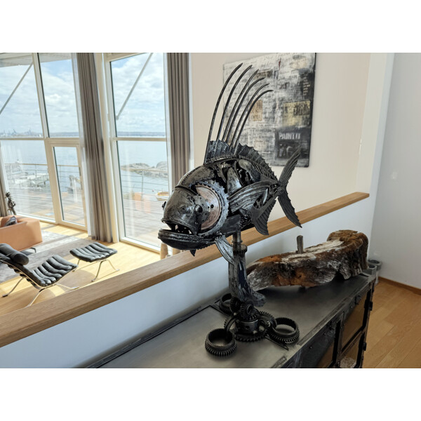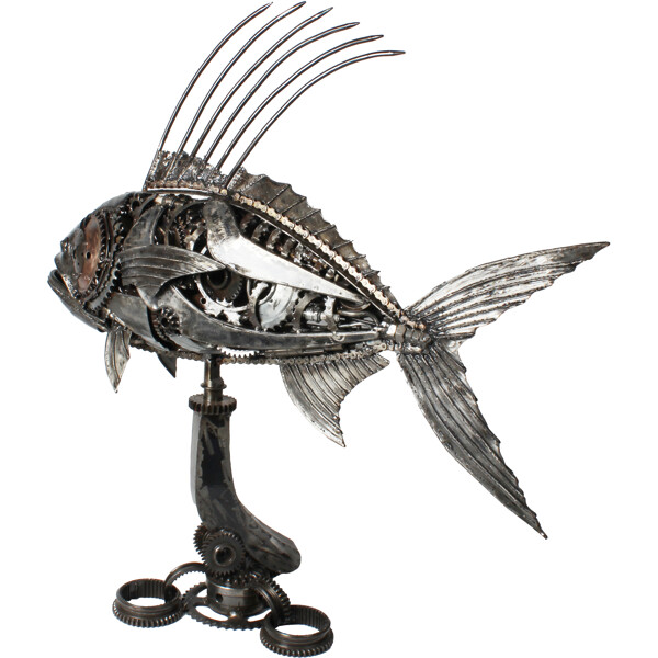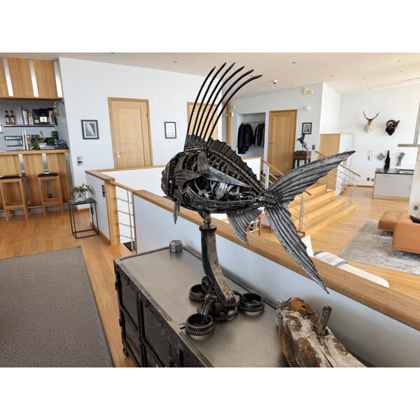 Våre talentfulle håndverkere har forvandlet resirkulerte materialer til en fengslende og detaljert avbildning av den distinkte hanefisken, kjent for sin praktfulle ryggfinne. Hvert tannhjul, hver kurve og hver komponent er nøye plassert, noe som skaper en virkelig unik skulptur som fremhever denne fiskens unike eleganse.