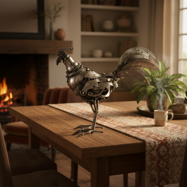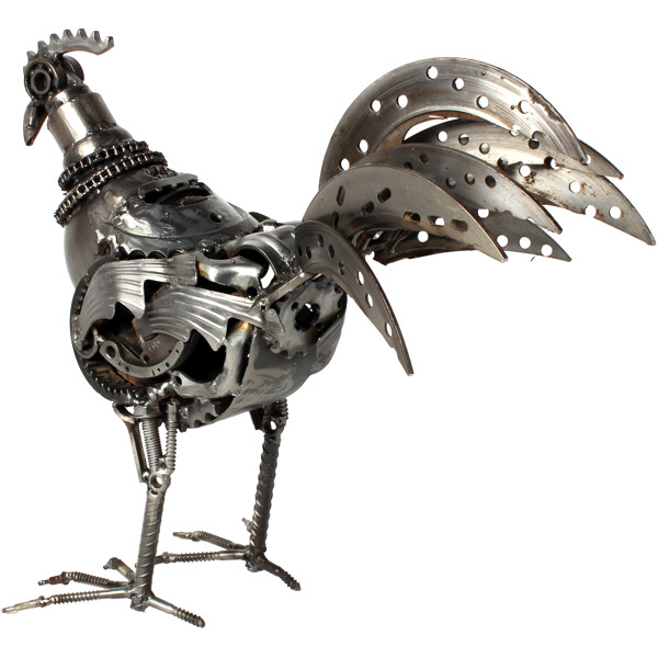 Våre dyktige håndverkere har forvandlet resirkulerte materialer og på en smart måte integrert tannhjul, kjeder og ulike metalldeler for å skape en storslått og detaljert representasjon av en stolt hane. Hver fjær i dens imponerende hale, dens sterke holdning og dens staselige kam er nøye integrert, noe som skaper en virkelig unik skulptur som kombinerer industriell estetikk med livlig bondegårdssjarm.