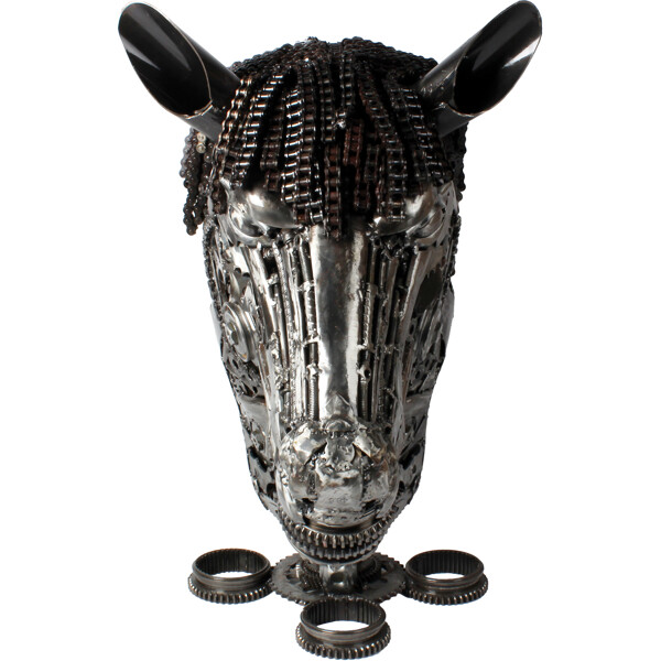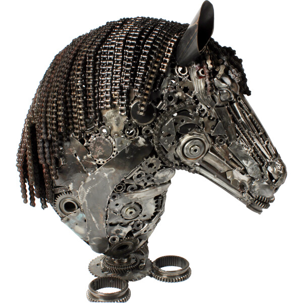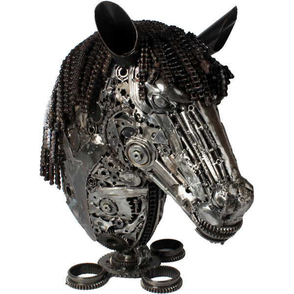 Fang oppmerksomhet med denne virkelig unike og praktfulle hestehode-skulpturen, et ekstraordinært verk av 100% håndlaget kunst. Hver detalj av dette kraftfulle hodet er nøye skapt av dyktige håndverkere fra resirkulert metall, som forvandler bortkastede komponenter til et forbløffende kunstverk som forteller en historie om oppfinnsomhet og bærekraft.