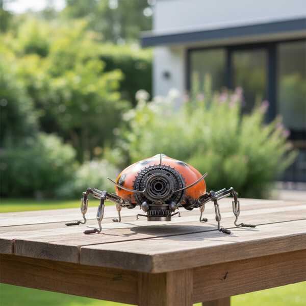 Våre dyktige håndverkere har omgjort resirkulert materiale – legg merke til det livlige oransjefargede skallet som står i kontrast til det metalliske hodet og bena laget av ulike mekaniske komponenter. Hver detalj, fra de karakteristiske prikkene til antennene og de flerleddede bena, skaper en virkelig unik skulptur som kombinerer robust industriell estetikk med den elskede formen av dette lykkebringende insektet.