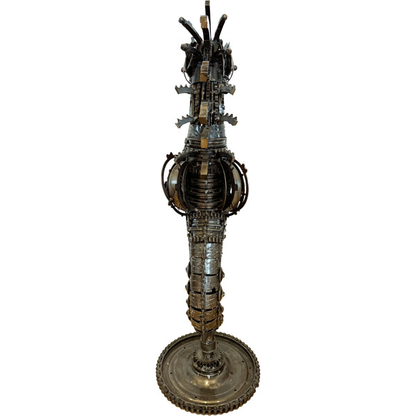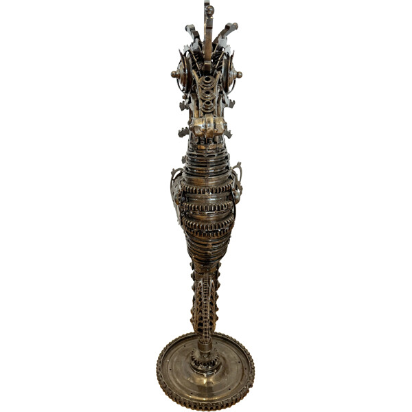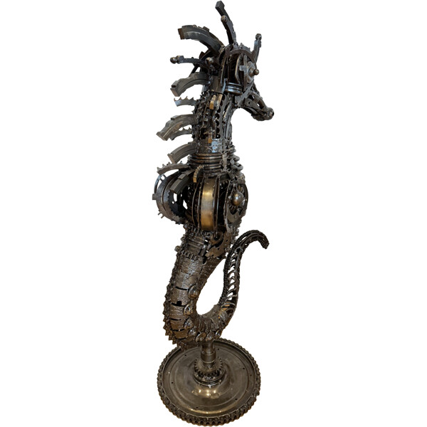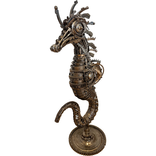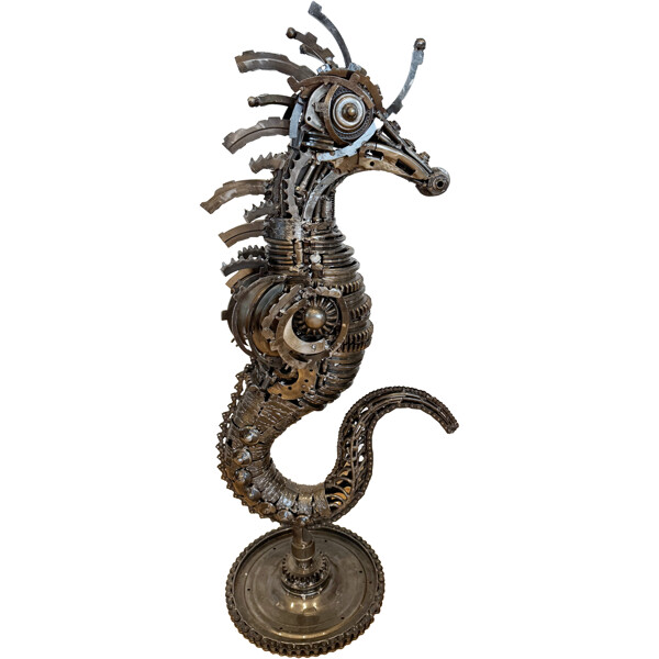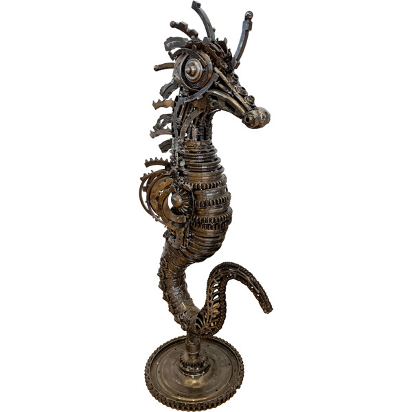 Våre dyktige håndverkere har forvandlet resirkulert materiale til en fengslende og detaljert representasjon av den grasiøse sjøhesten. Hvert tannhjul, skrue og metallkomponent er gjennomtenkt, noe som skaper en virkelig unik skulptur som fremhever skjønnheten og den delikate naturen til denne fascinerende skapningen. Stående stolt på en solid base, er denne skulpturen designet for å imponere.