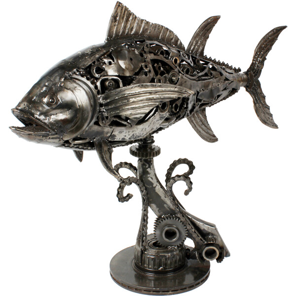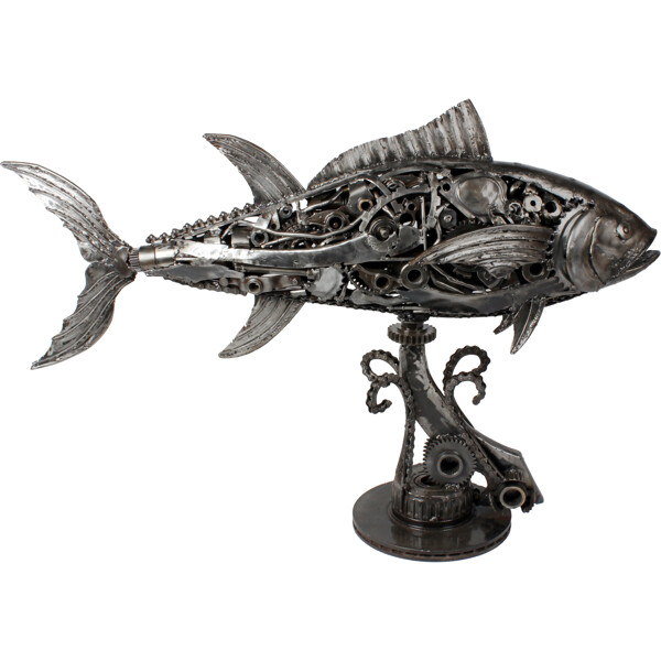 Ta inn den dynamiske energien fra havet i ditt rom med denne utrolige 100% håndlagde metallskulpturen av en tunfisk! Dette er ikke bare en dekorativ gjenstand; det er et unikt kunstverk, nøye laget av resirkulert metall, noe som gjør det til et bærekraftig og fantastisk tillegg til ethvert hjem eller kontor. Våre dyktige håndverkere har forvandlet resirkulerte materialer til en kraftfull og detaljert representasjon av den mektige tunfisken. Hver komponent, fra de intrikate tannhjulene til de elegante linjene på kroppen, er gjennomtenkt plassert, noe som skaper en virkelig unik skulptur som fanger essensen av denne hurtiggående fisken. Mål: Omtrent 40 x 95 x 60 cm Miljøvennlig 100% Håndlaget Resirkulert Metall