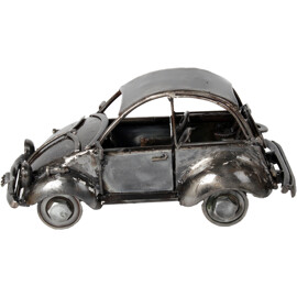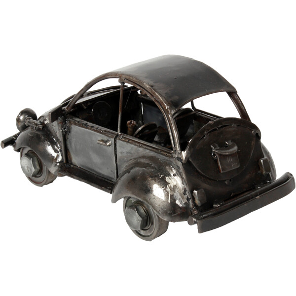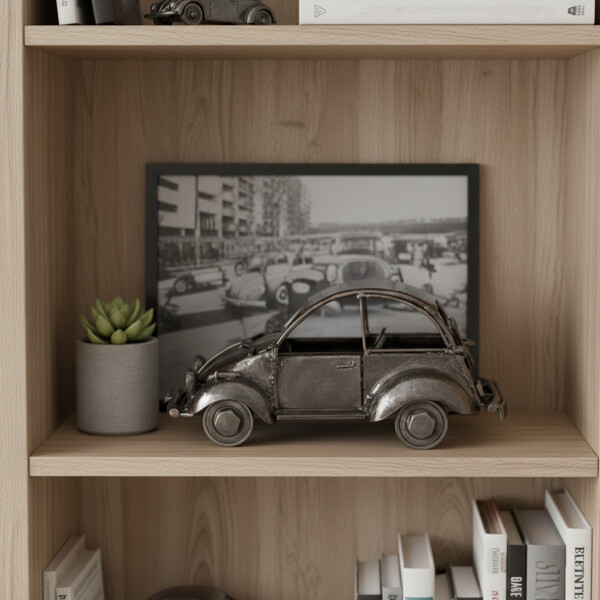 Legg ut på en nostalgisk reise med vår Vintage Beetle-skulptur, et 100% håndlaget kunstverk laget av resirkulert metall. Denne unike skulpturen har detaljer, fra klassiske frontlykter til dører som kan åpnes, og er en liten del av bilhistorien. Perfekt for skrivebord eller hyller, dens rustikke patina og gjenbrukte komponenter tilbyr en blanding av vintage sjarm og moderne bærekraft, noe som gjør den til en ideell hyllest for bilentusiaster og kunstelskere.