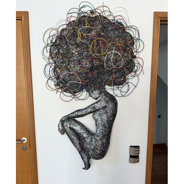 Skap en kraftfull kunstnerisk design i hjemmet ditt med denne praktfulle håndlagde metallveggkunsten. Nøye skulpturert av metall, har denne unike veggkunsten en abstrakt feminin figur med en dynamisk, voluminøs form skapt av sammenflettede metallringer, som skaper en fengslende visuell tekstur. 100% håndlaget, den er et resultat av ekte håndverk og kreativitet, perfekt for å legge til et slående fokuspunkt på hvilken som helst stor vegg.