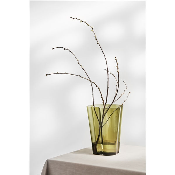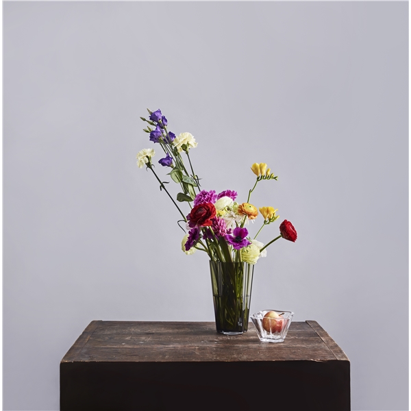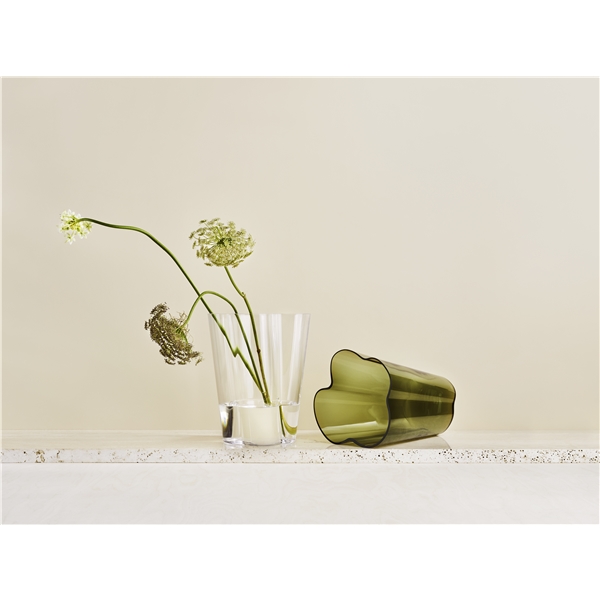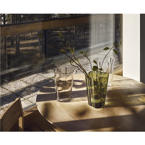 Design: Alvar Aalto Elegant vase i Alvar Aalto Collection. En variant av de høye vasene som ble presentert ved den finske paviljongen under verdensutstillingen i New York i 1939. Denne størrelsen og modellen er utformet for ulike typer av funksjonelle blomsterarrangement og med sine myke, bølgelignende form tillater vasen blomster og kvister å falle naturlig på plass. Vasen er munnblåst i Iittalas glassfabrikk. Størrelse: Høyde: 22 cmMaterial: Glass