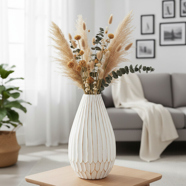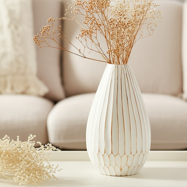 Forhøy ditt hjem med den unike teksturen og det håndverksmessige sjarmen til disse vakkert håndlagde tredekorasjonene, tilgjengelige i klassisk svart eller ren hvit. Skånsomt laget i Thailand, har hver vase en distinkt vertikalt riflet overflate, komplettert med et intrikat bikakemønster ved basen, som skaper en fengslende visuell og taktil opplevelse. Disse miljøvennlige gjenstandene er et bevis på ekte håndverk, perfekte for å forskjønne ditt rom med bærekraftig kunst og moderne stil. Størrelse: Omtrent 13 x 13 x 20 cm Materiale: Laget av 100% naturlig tre. Håndlaget Eksellens: Hver vase er fullstendig håndlaget og gjennomgår en intrikat prosess av sliping, utskjæring, forming, utjevning og maling, som garanterer dens unike karakter og overlegne kvalitet. Miljøvennlig: En dekorativ artikkel fra Thailand som støtter en økologisk bevisst livsstil. Unik Tekstur: Viser en fengslende teksturert overflate med vertikale riller og en distinkt bikakemønstret base, ideell for å tilføre dybde og organisk eleganse til din innredning.