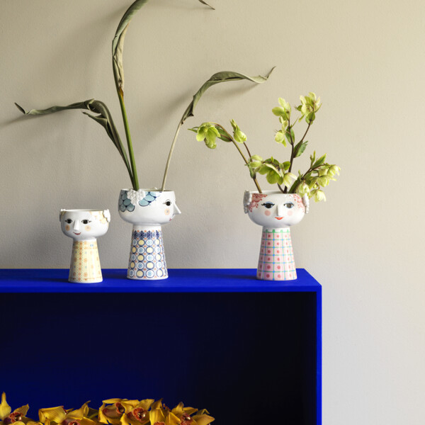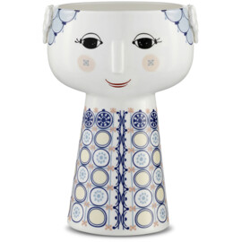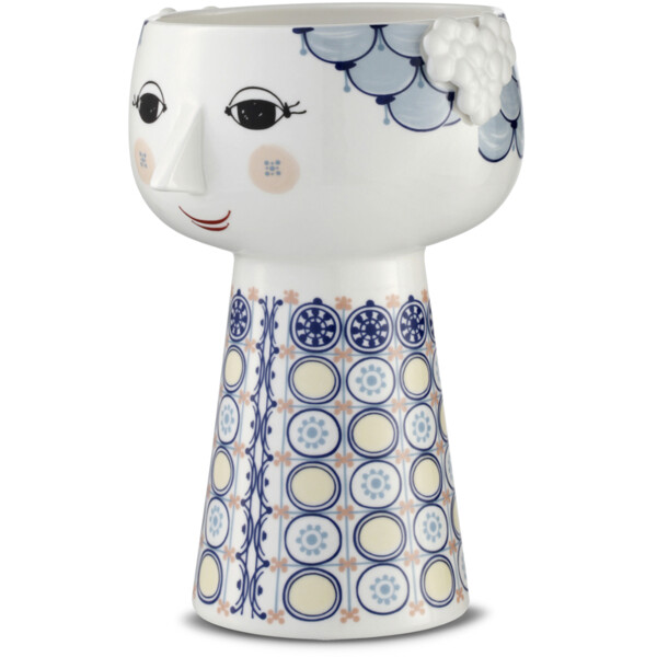 Fin Eva-vase fra Bjørn Wiinblad i en herlig blå nyanse. Vasen er 18,5 cm høy og har en diameter på 11 cm, noe som gjør den perfekt for vakre blomsterbuketter eller for en enkelt stor blomst. Vasen er laget i blankglasert porselen med farget dekor og er inspirert av Bjørn Wiinblads opprinnelige EVA-vaser, som hadde brede hoder og en konformet kropp. Det utsøkte ansiktet har Bjørn Wiinblad tegnet selv, og kjolemønsteret kommer fra hans illustrasjoner.