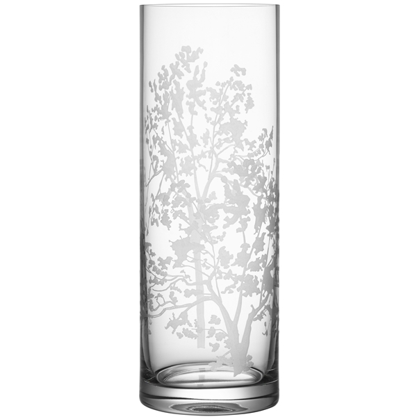 Design: Magnus ForthmeiierRundt vasen står trærne samlet lik skygger. Sagaens skog er etset i krystallens flate. Det speilblanke tjernet som skimtes mellom stammene er en optisk illusjon som lokkes frem av det tykke glasset i vasens bunn. Minimalistisk, ren design med en stilrik dekor som gjør denne vasen like vakker med blomster, som uten. Størrelse