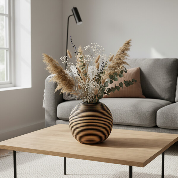 Tilfør en fascinerende blanding av naturlig varme og grafisk design i hjemmet ditt med denne utsøkte håndlagde dekorative trevasen. Omhyggelig laget i Thailand, har den en distinkt sfærisk form prydet med elegante horisontale striper der de naturlige tretonene vakkert alternerer med mørkere aksenter, noe som skaper et slående visuelt utseende. Denne miljøvennlige vasen er et ekte håndverk, perfekt for å forskjønne hjemmet ditt med bærekraftig skjønnhet og en unik moderne touch.