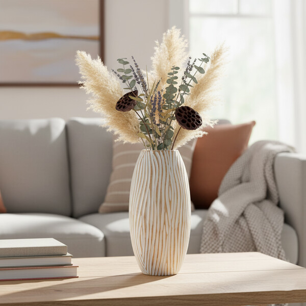 Forhøy interiøret ditt med den organiske skjønnheten og det håndverksmessige sjarmen til denne unike håndlagde dekorative trevasen. Nøye laget i Thailand, har den en bølget vertikal riflet overflate i hvitt, som viser det naturlige treverket under, og skaper en fengslende visuell opplevelse. Denne miljøvennlige vasen er et resultat av ekte håndverk, perfekt for å forbedre hjemmet ditt med bærekraftig kunstnerisk uttrykk og moderne tiltrekning.