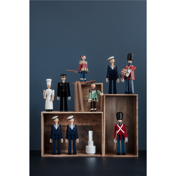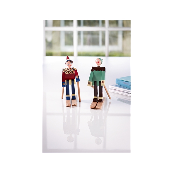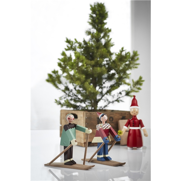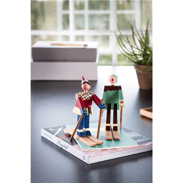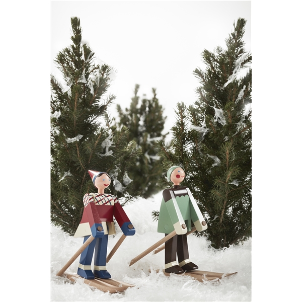 På slutten av 1940-tallet tegnet Kay Bojesen de to glade skiløperne. Den glade skiløperjenta med røde kinn og et stort smil har fått navnet Datti, som var kallenavnet for Kay Bojesens svigerdatter Ruth (gift med Otto). Den mannlige skiløperen, Boje, er oppkalt etter kallenavnet på Kay Bojenes sønn, Otto. De opprinnelige trefigurene er ganske sjeldne, da de kun ble produsert i små serier. Med sitt muntre uttrykk lokker de to skiløperne alltid frem et smil og de er med denne nylanseringen klar til å innta de svenske hjem igjen. De to skiløperne er produsert i malt bok, akkurat som Slottsvakten. Skiløperne er 15,5 cm høye. Størrelse: Bredde 17 cm. Høyde 15,5 cm. Dybde 6 cm. Materiale: Malt bok.