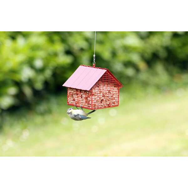 Denne hengende fuglemateren, i form av en liten hytte, er finurlig konstruert. Den er laget for peanøtter, som legges i et metallnett som gir minimal risiko for at avføring kommer i kontakt med maten. Den er utformet slik at små fugler lett kan sitte på den og spise fra forskjellige retninger, men den egner seg ikke for de større fuglene. Meiser, som for eksempel blåmeis, er spesielt glad i peanøtter.
