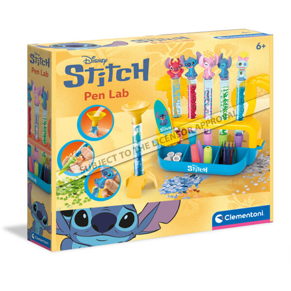 I Pen Creator Studio finnes en arbeidsstasjon og verktøy for å tilpasse hver penn med unike tilbehør og dekorasjoner med Stitch-tema. Settet inneholder fem penner, farget blekk, glitrende dekorasjoner, karakterklistremerker, perler og mye mer, noe som gir uendelige muligheter for kreativitet.