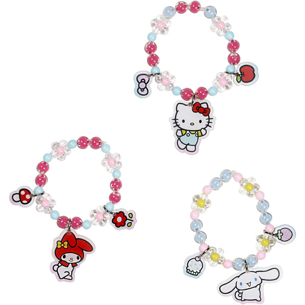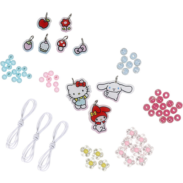 Her finnes det 60 perler i forskjellige farger, ni fine anheng med Hello Kitty og elastisk snor - alt som trengs for å lage tre personlige armbånd. Barna trer enkelt perler og anheng på snoren og knyter sammen. Så har de egne smykker å bære med stolthet eller gi bort som gave til en venn!