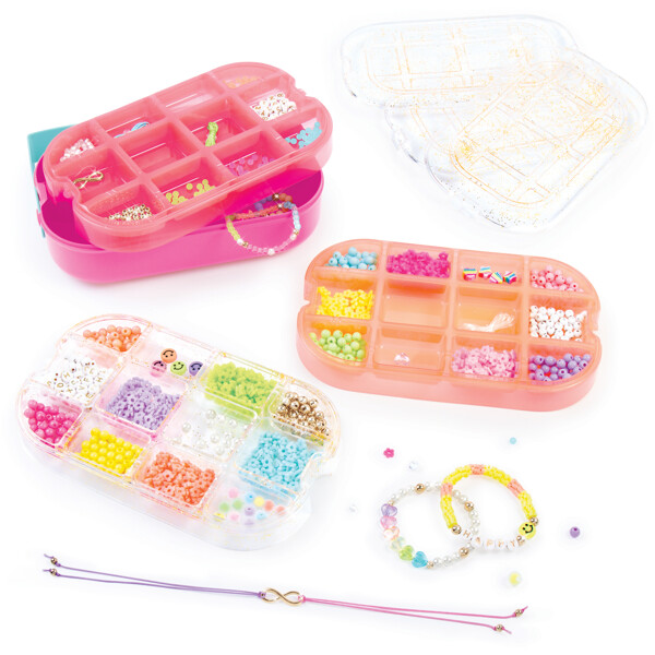 Med smarte detaljer som hjelper deg med å legge ut perlemønstre, måle snorlengde og sortere utvalgte perler, blir det enkelt å skape. Barna kan lett oppbevare alt sitt materiale og bruke det komfortable håndtaket for å ta med seg settet til lekemøter eller hvor enn inspirasjonen slår til!