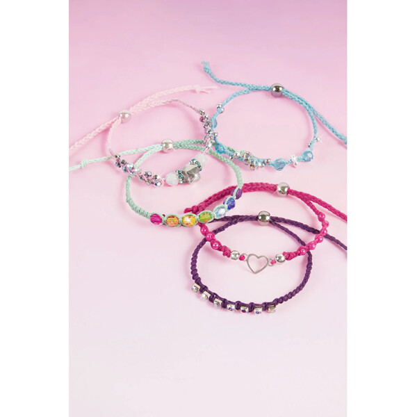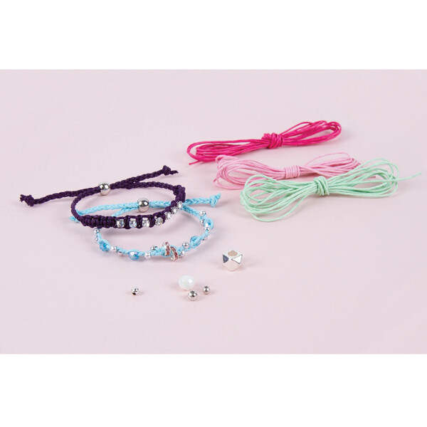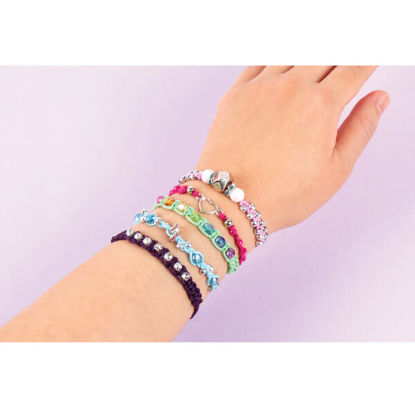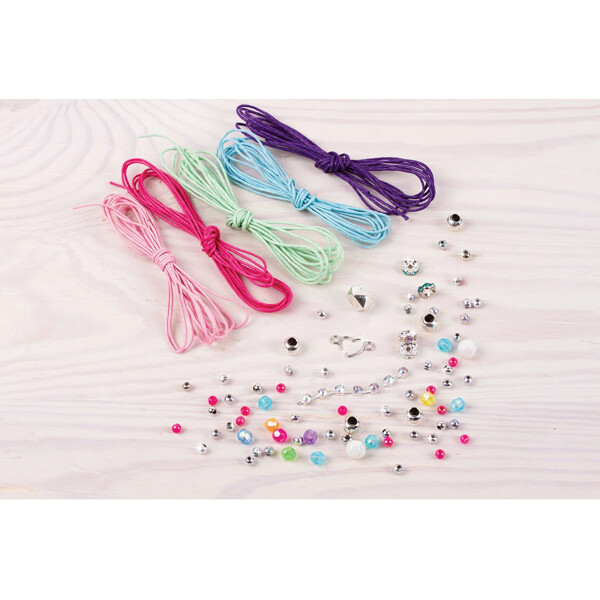 Lær deg enkle knytteteknikker for å skape fem vakkert utformede armbånd ved hjelp av dette omfattende settets mix-and-match voksede snorer og trendy perler.