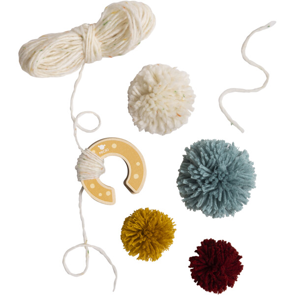 Med malene kan barnet lage ubegrenset mange pom poms i forskjellige størrelser - om og om igjen! I settet inngår også fire garn i ulike strukturer og farger. Disse fine hobbylekene i tre har alt dere trenger for å la fantasien flyte og oppfordrer til timer med kreativ lek. Skap fargerike motiver sammen - perfekt for en liten hobbyentusiasts små hender!