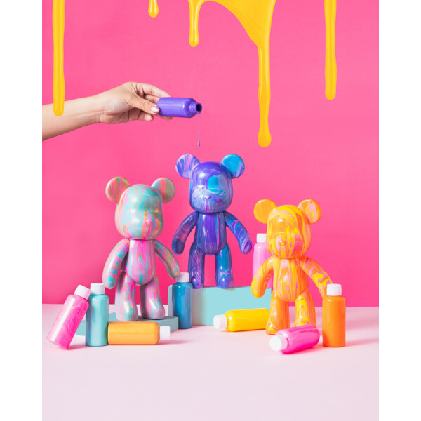 Pour Palz-bjørnen mangler farge. Bland fargen som du vil, hell den over figuren og la den tørke. Du får en helt unik samlefigur som ikke ligner noen annen!
