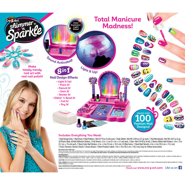 Design vakre og fargerike negler med Shimmer ‘n Sparkle 8 in 1 Lite-Up Designer Nail Studio. Tenn lyset og manikyr neglene dine! Bruk fantasien din med massevis av edelstener, folie, glitter og klistremerker! Avslutt negledesignene dine med den medfølgende ekte negletørkeren!