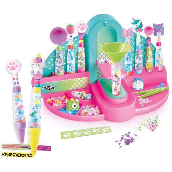 Lag din egen samling av DIY-kulepenner og markører! Bruk "fabrikken" for å fylle pennene dine, tilsett vann og dekorasjoner – og gjør dem helt unike, helt ned til viskelæret! Dekorer 8 penner og markører med massevis av morsomme tilbehør som er inkludert.Inneholder:- 1 studio- 6 DIY-kulepenner- 6 avtagbare spisser- 2 DIY-markører- 1 pinsett, 1 trakt, 1 skje- 1 ark med klistremerker- 2 mønsterstenciler- 8 dekorative viskelær- 5 poser med dekorasjoner- 3 poser med perler- 1 pose med pomponger- 1 bruksanvisning