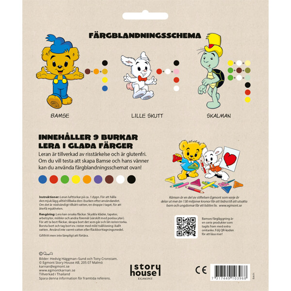 Leiren er laget av risstivelse og er glutenfri. Hvis du vil prøve å lage Bamse og vennene hans, kan du bruke fargeblandingsskjemaet på baksiden av esken.