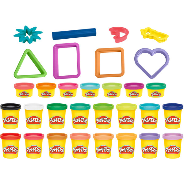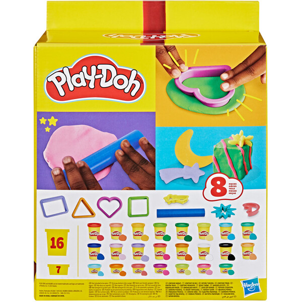 Settet er utformet for å vekke kreativiteten hos barn med 23 bokser med livlig modelleringsmasse og 8 viktige Play-Doh-tilbehør. Settet inneholder 7 utstikkere i morsomme former som trekant, rektangel, kvadrat, hjerte, måne, komet og stjerneskudd, slik at barna kan utforske ulike former og mønstre. En rulle følger også med for å jevne ut massen og gjøre det lettere å bruke utstikkerne.