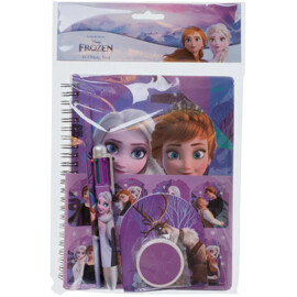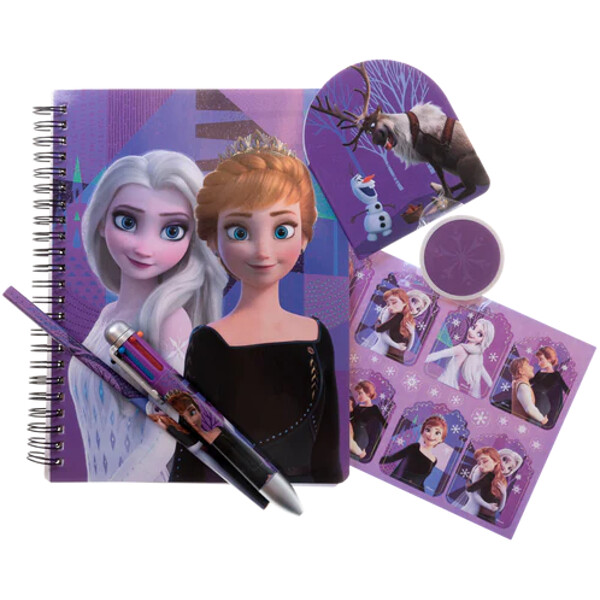 Disney Frozen Skrivesett med A5 spiral notatbok med 60 linjerte sider (mykt omslag på A5 notatbok 350gsm) flerfarget penn, klistremerke, blyant, viskelær og lite notatblokk med 40 sider.
