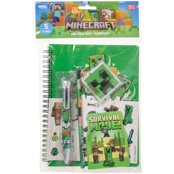 Minecraft skrivesett med A5 spiral notatbok med 60 linjerte sider (mykt omslag på A5 notatbok 350gsm) flerfarget penn, klistremerke, penn, viskelær og lite notatblokk med 40 sider.