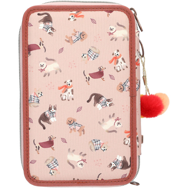 Søt og praktisk pennal fra TOPModel-serien FUR EVER FRIENDS i pudder- og kobberfarger med et søtt all-over-mønster av hunder og katter samt et stort motiv av TOPModellen Candy som holder to hunder og en katt på forsiden. De tre separate rommene er komplett fylt med alt som trengs for å tegne, skrive og pusle: hver med 18 farge- og tusjpenner, 2 blyanter, blyantspisser, viskelær, linjal, saks, limstift samt en liten borrelåslomme.