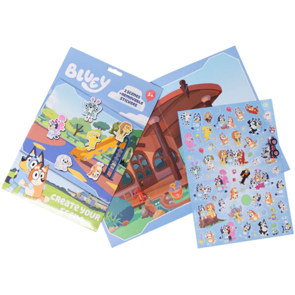 Lag din egen scene i Blueys verden! Perfekt hobbyaktivitet som holder barna opptatt lenge. Kan brukes om og om igjen da klistremerkene er avtakbare.