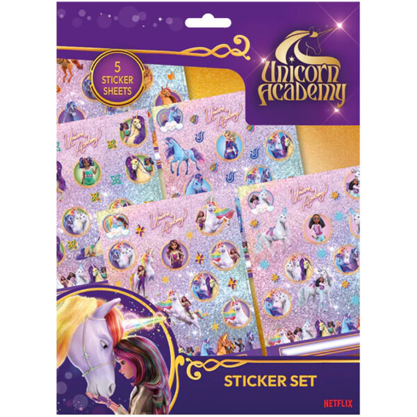 Unicorn Academy klistremerkeark med 5 x 20 klistremerker = totalt 100 klistremerker.